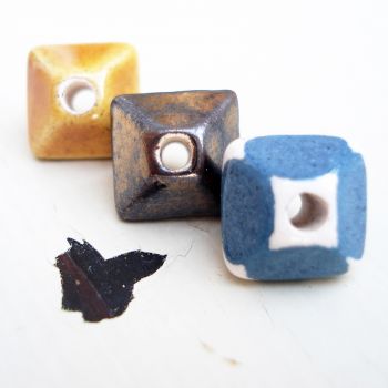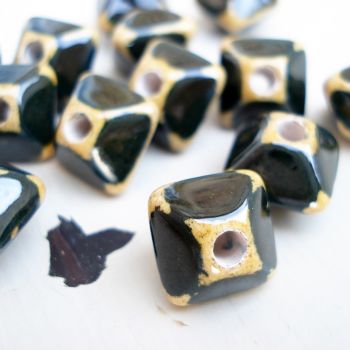 Greek ceramic 12mm oxyhedron bead with a shabby enamel two colour glaze - Bumble (mustard & black)