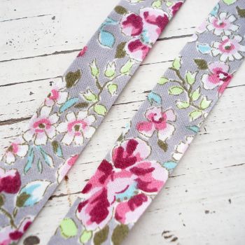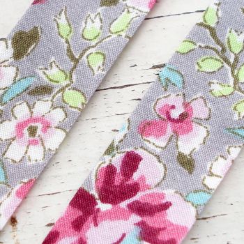 18mm floral patterned bias binding - Grey base with pink and green flowers and leaves